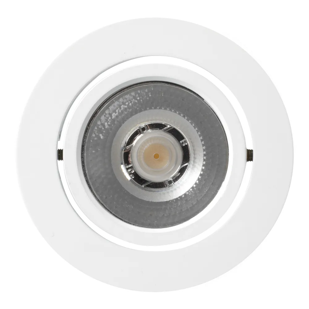 Врезной круглый мебельный светильник 5Вт, корпус белый алюминий. Цвет ТЕПЛЫЙ БЕЛЫЙ 3000K. Светодиод 1х5W Bridgelux. CRI>80, Св.поток 350-400лм, наклоняемая ось, угол 10°. Питание 180-240VAC, 5Вт, 400mA 11-13V, драйвер в комплекте. Размеры d65x20 мм, врезное отверстие d55 мм.