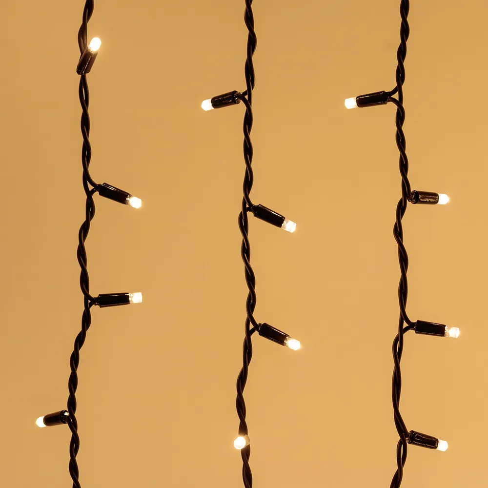 Светодиодный Занавес Pro. Размер 2000x3000 мм (длина 2000 мм, высота 3000 мм). 20 ниспадающих нитей длиной 3000 мм. 760 светодиодов размером 7 мм. Цвет свечения ТЕПЛЫЙ БЕЛЫЙ (3000 К), постоянное свечение и 8 динамических эффектов с резким световым рисунком (прозрачная вогнутая линза). Провод черный, каучук. Питание 230 В, Мощность 70 Вт, защита IP65, применение в помещении и на улице под навесом. Аксессуар для подключения и выбора режима свечения в комплекте.