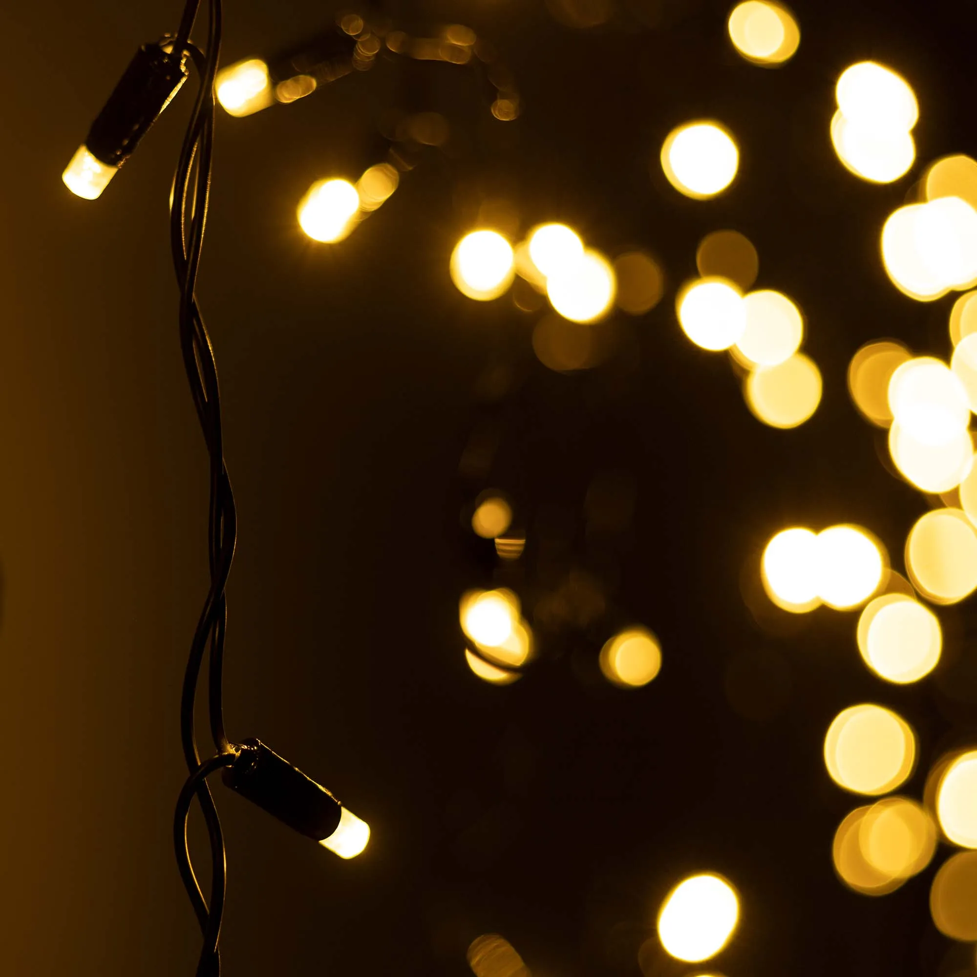 Светодиодная бахрома Classic. Размер 2400 мм (длина 2400 мм, по длине 24 нити высотой 200/600 мм). Количество светодиодов 88 шт размером 7 мм. Основной цвет свечения ТЕПЛЫЙ БЕЛЫЙ (3000 К), эффект мерцания редких точек (ТЕПЛЫЙ БЕЛЫЙ 3000К) с резким световым рисунком (прозрачная вогнутая линза), соотношение светодиодов: 66 теплых постоянного свечения / 12 теплых с мерцанием. Провод черный, ПВХ. Питание 230 В, Мощность 6 Вт, защита IP65, применение на улице под навесом. Аксессуары для подключения приобретаются отдельно.