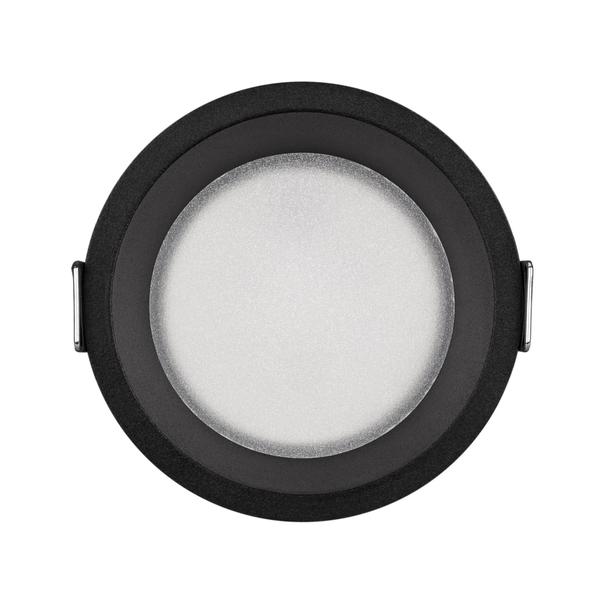 Встраиваемый светильник даунлайт. Мощность 9 Вт, св. поток 500 лм, 56 лм/Вт, дневной 4000 K, CRI>90, угол 80°, напряжение питания 230 В. Чёрный круглый корпус из алюминия, степень защиты IP20. Размер: диаметр 82 мм, высота 46 мм. Монтаж встраиваемый, установочное отверстие: диаметр 75 мм. Драйвер 27-42 В, 200 мА, пульсация <2%.