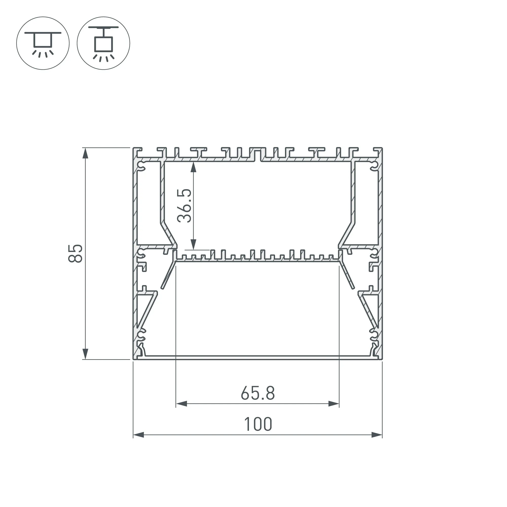 Под заказ от 10 м. Алюминиевый анодированный профиль для светодиодных лент и линеек. Габаритные размеры (L×W×H): 2000x100x85 мм. Ширина площадки для ленты 65,8 мм. Состоит из профиля и основания для ленты. Для их соединения необходим Фиксатор основания арт. 036434 (приобретается отдельно, 4 шт. на 2 м. профиля). Отсек для БП 64х33 мм. Экраны, заглушки и другие аксессуары приобретаются отдельно. Цена за 1 метр.
