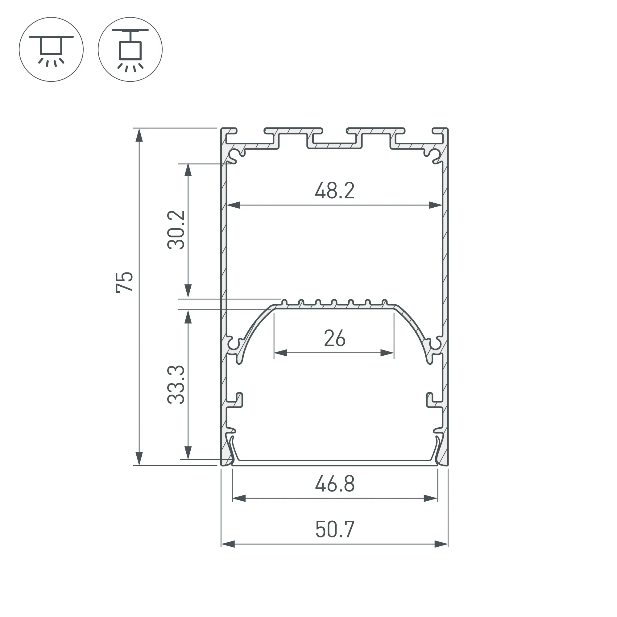 Алюминиевый анодированный профиль для светодиодных лент и линеек. Габаритные размеры (L×W×H): 2500x50,7x75 мм. Ширина площадки для ленты 26 мм. Отсек для БП 48,2х30,2 мм. Экраны, заглушки и другие аксессуары приобретаются отдельно. Цена за 1 метр.