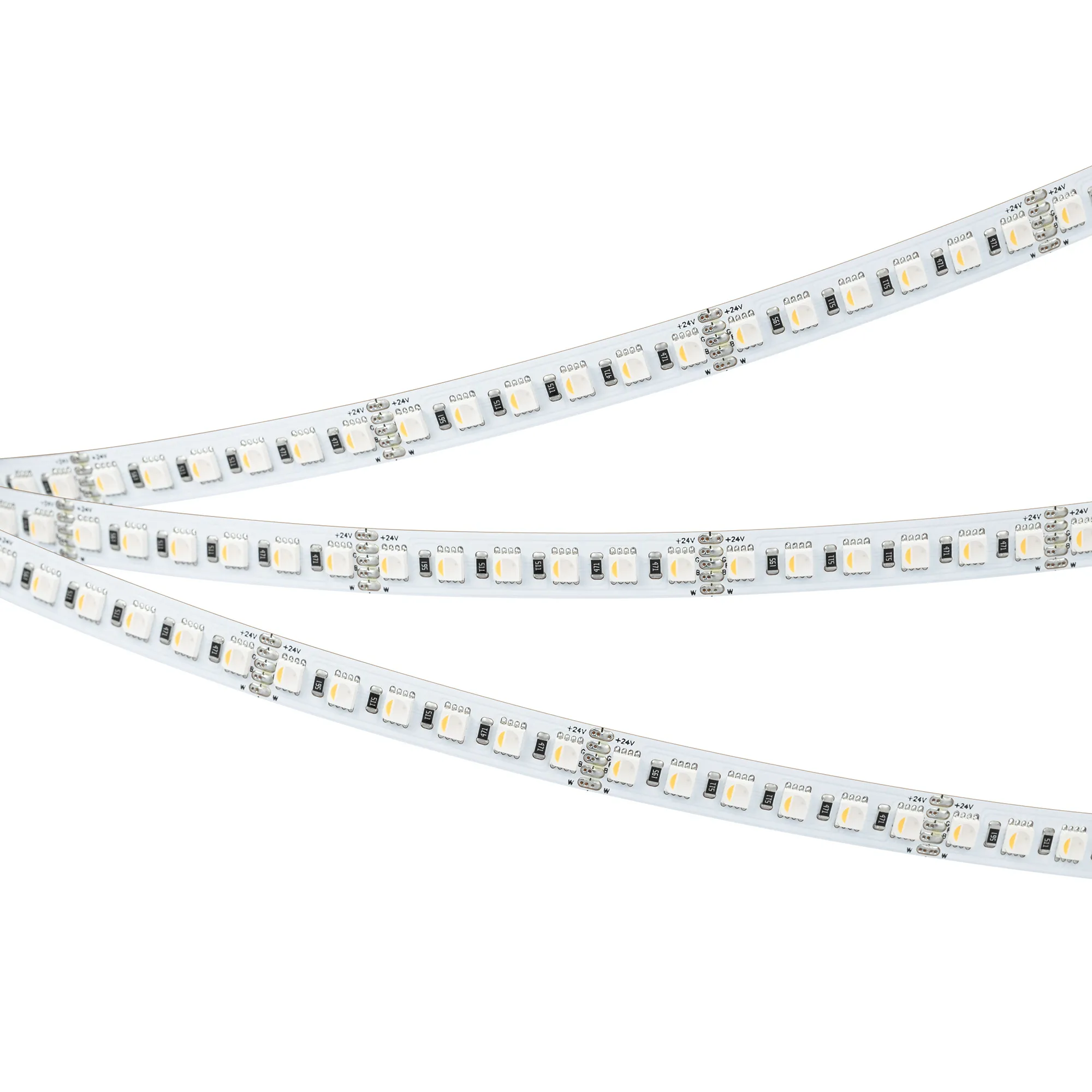 Светодиодная мультицветная лента RT серии H120. Светодиоды SMD 4040, 120 шт/м, белая плата шириной 10 мм, скотч 3M. Цвет RGB + ТЕПЛЫЙ 2700K, индекс цветопередачи CRI>90, угол 120°. Питание 24 В, мощность 25 Вт/м (125 Вт на 5 м). Размеры 5000x10x2.1 мм, мин. отрезок 50 мм, 6 светодиодов. Цена за 1 м.