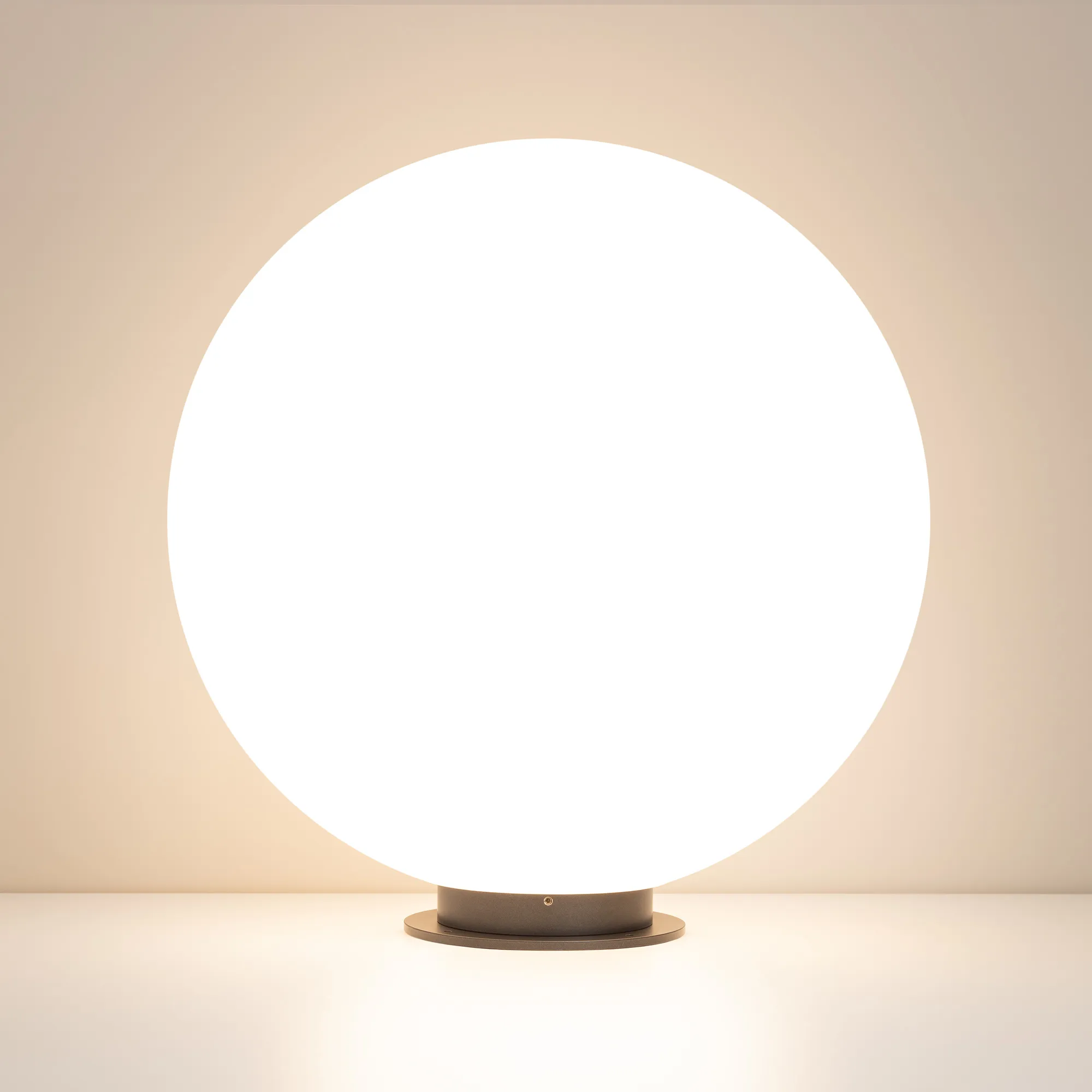 Декоративный ландшафтный светильник. Мощность 15 Вт, св. поток 1500 лм, 100 лм/Вт, теплый 3000 K, CRI>80, угол 275°, напряжение питания 24 В. Белый светопропускающий сферический рассеиватель из LLDPE (линейный полиэтилен низкой плотности), основание из алюминия серого цвета, степень защиты IP65. Размер: диаметр 500 мм, высота 500 мм. Монтаж на твердую поверхность или в грунт с помощью двух оснований пик (входят в комплект поставки). Допускается регулирование светового потока ШИМ.