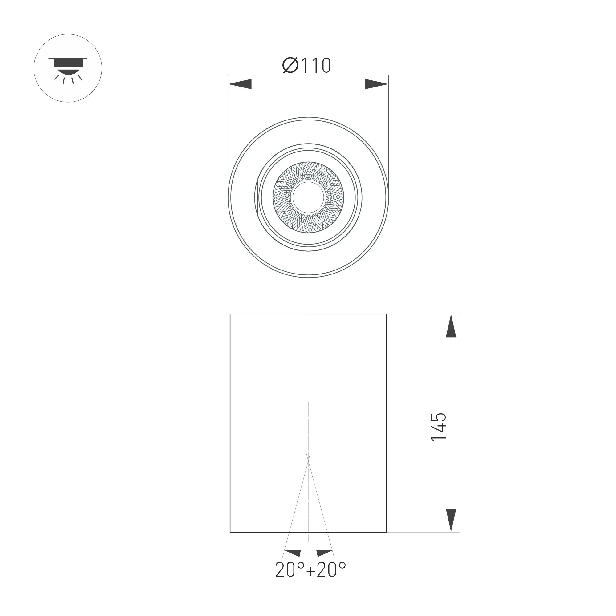 Накладной интерьерный светильник. Мощность 18 Вт, св. поток 1700 лм, 99 лм/Вт, дневной 4000 K, CRI>90, угол 24°, регулируемое направление луча 40°(20+20), поворотный световой модуль вокруг своей оси на 340°, UGR <11, напряжение питания 230 В. Чёрный круглый корпус из алюминия, степень защиты IP54. Размер: диаметр 110 мм, высота 145 мм. Монтаж накладной. Драйвер 27-43 В, 450 мА, пульсация <1%.