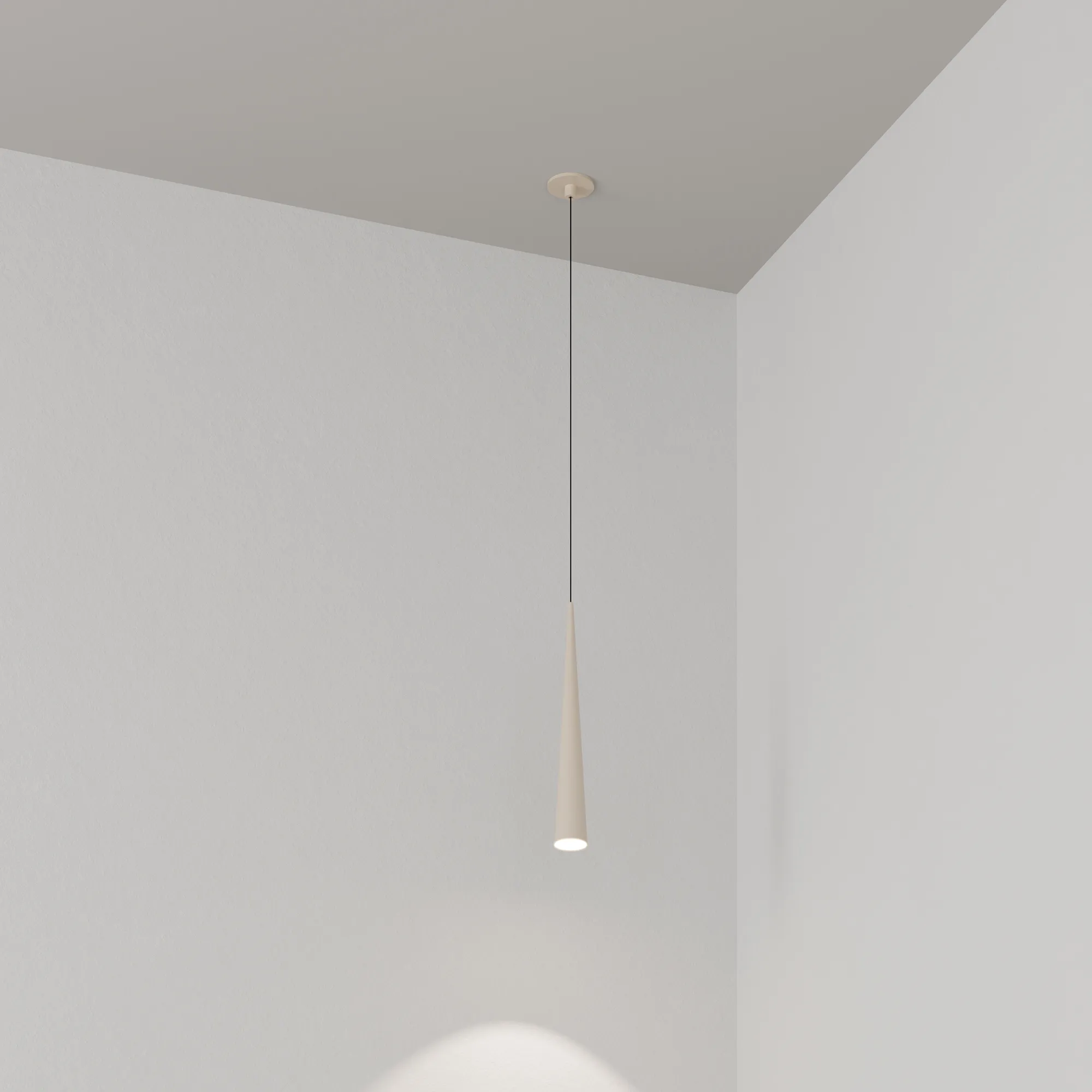 Подвесной светильник. Мощность 5 Вт, св. поток 400 лм, световая эффективность 70 лм/Вт, теплый 2700 K, CRI>92, угол 36°, напряжение питания 230 В. Кремовый конусообразный вытянутый корпус из алюминия, линза из PMMA, степень защиты IP20. Размер: диаметр 57 мм, высота 400 мм. Монтаж подвесной, длина подвеса 2000 мм, регулируемая. В комплекте 2 вида чаш. Габариты встраиваемой чаши: Ø 80x41 мм. Габариты накладной чаши Ø80x60 мм. Драйвер 2,8-12В, 500 мА, пульсация <1%.