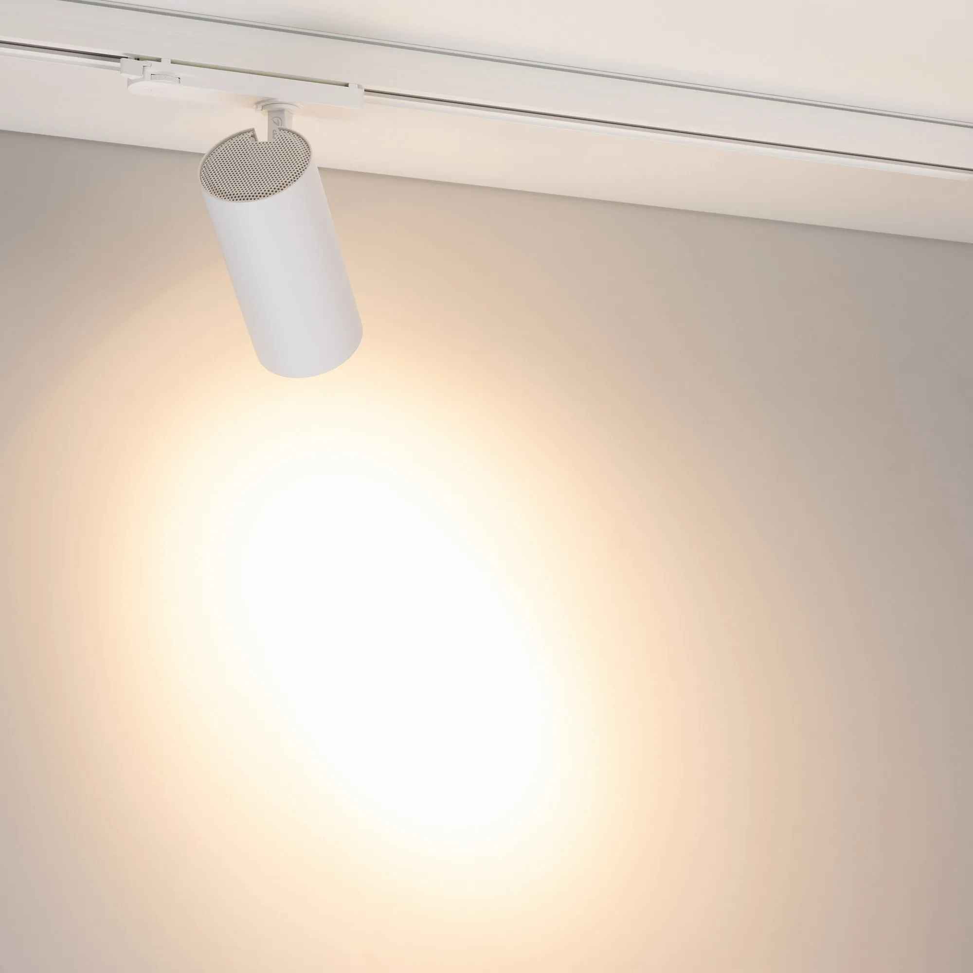 Светильник для треков/шин 4 провода. Мощность 20 Вт, св. поток без решетки honeycomb 2000 лм, 100 лм/Вт, с решеткой honeycomb 1320 лм, 66 лм/Вт, теплый 3000 K, CRI>90, угол 15°, напряжение питания 230 В. Белый круглый корпус из алюминия, материал линзы PMMA, степень защиты IP20. Размер: диаметр 74 мм, длина световой части 154 мм. Монтаж на трек 3-фазный. Драйвер встроенный 24-42 В, 500мА., пульсация <5%