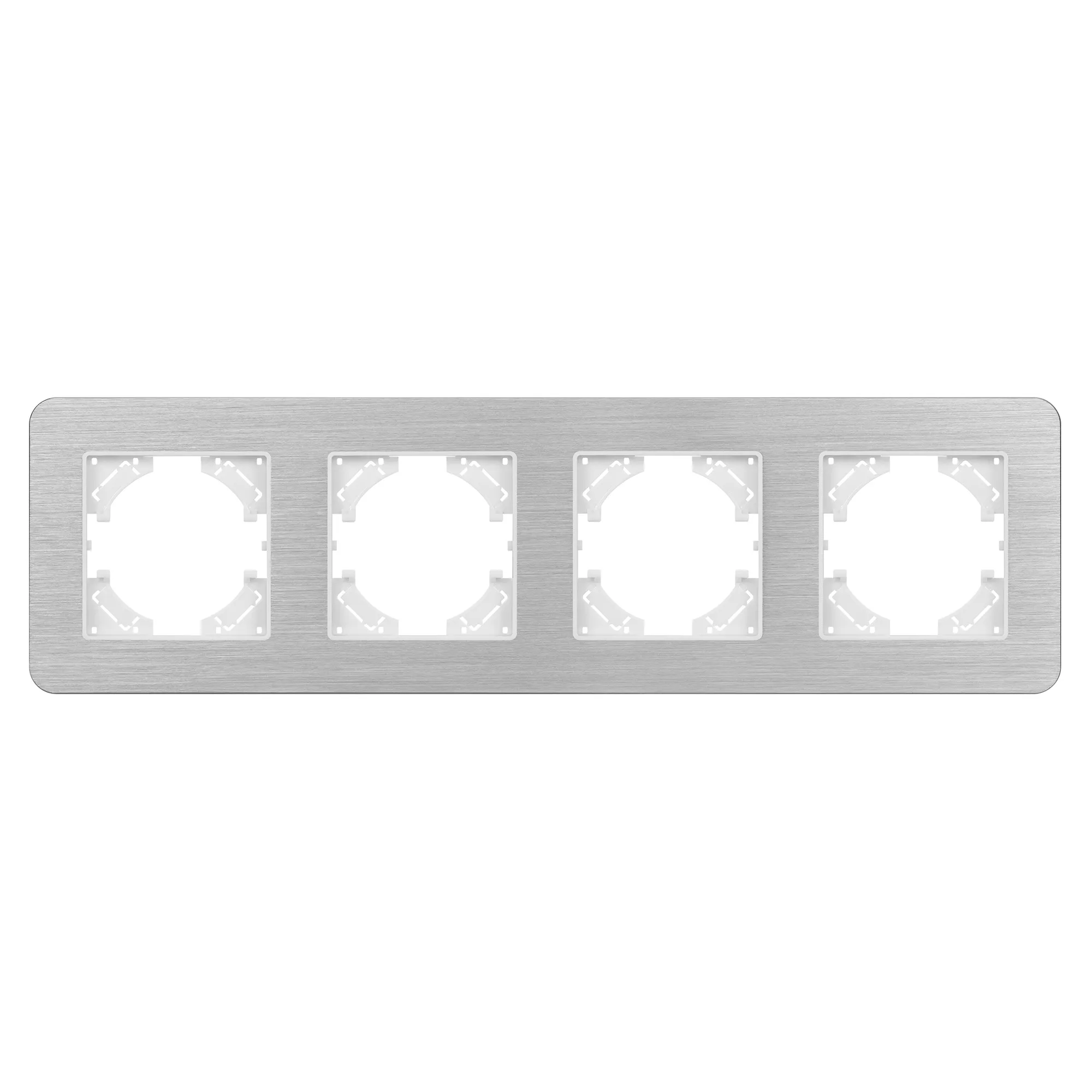 Рамка алюминиевая на 4 поста, под встраиваемый механизм. Цвет - серебристый. Уровень герметичности IP20. Ориентация монтажа - горизонтальная (основным ориентиром служат посадочные выступы для накладки механизма).