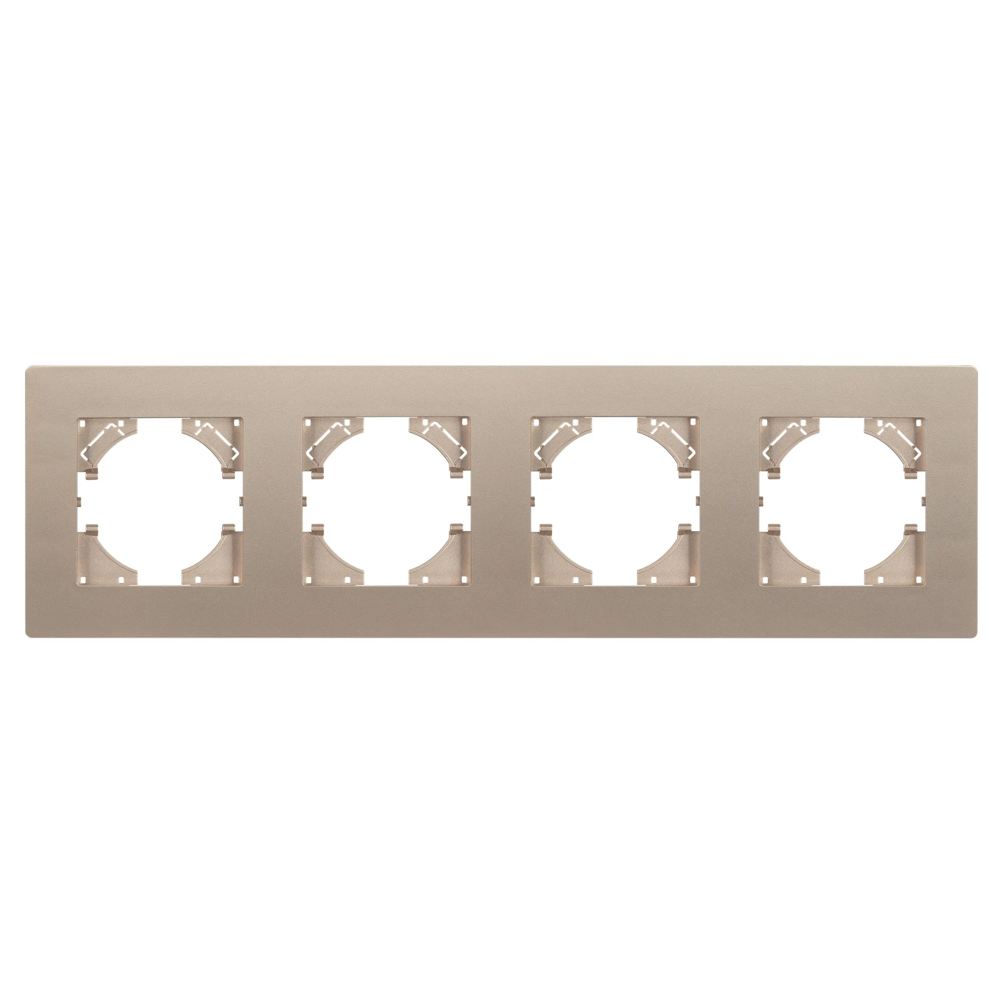Рамка пластиковая на 4 поста, под встраиваемый механизм. Цвет - золотой. Уровень герметичности IP20. Ориентация монтажа - горизонтальная (основным ориентиром служат посадочные выступы для накладки механизма).
