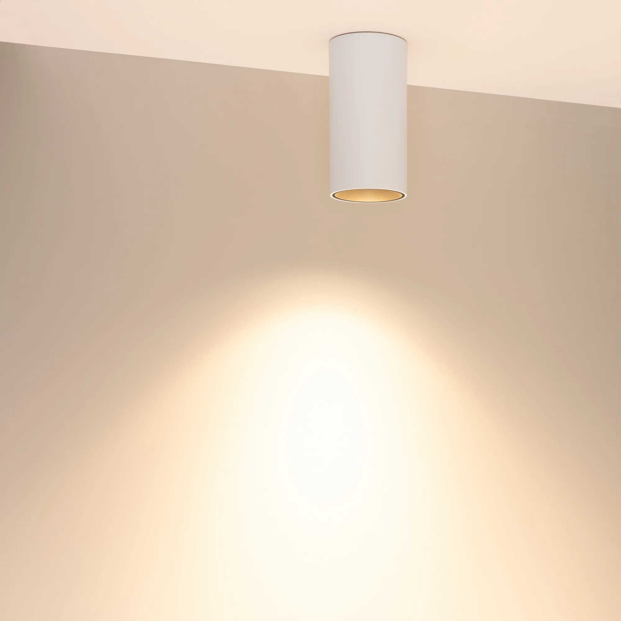 Накладной интерьерный светильник. Мощность 15 Вт, св. поток 1200 лм, 80 лм/Вт, теплый 3000 K, CRI>90, угол 40°, напряжение питания 230 В. Белый круглый корпус с черной вставкой из алюминия, степень защиты IP54. Размер: диаметр 75 мм, высота 152 мм. Монтаж накладной. Драйвер 22-40 В, 350 мА, пульсация <1%.