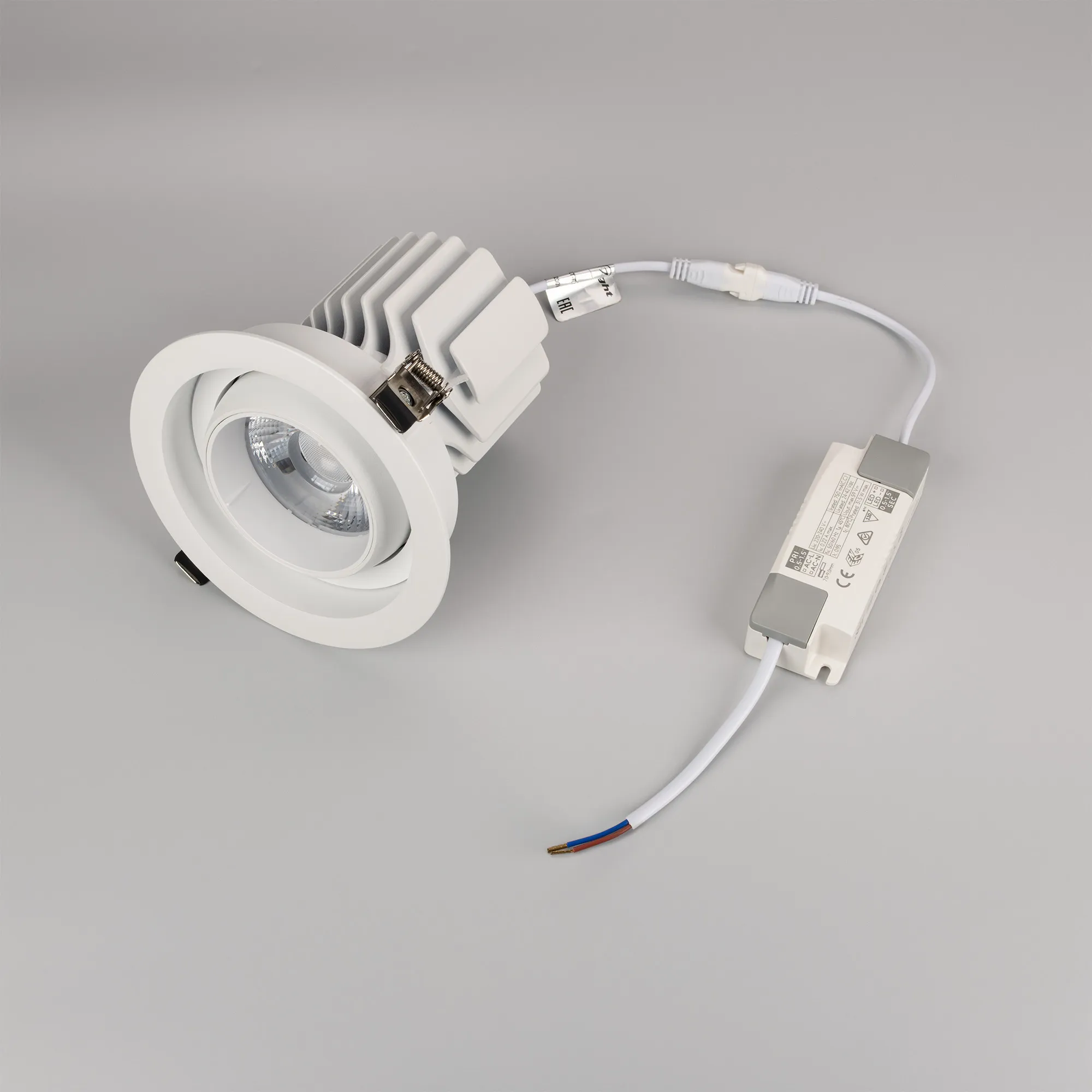 Встраиваемый карданный светильник. Мощность 30 Вт, св. поток 3260 лм, 108 лм/Вт, дневной 4000 K, CRI>92, угол 30°, напряжение питания 230 В. Белый корпус из алюминия, белая вставка, степень защиты IP20. Размер: диаметр 135 мм, высота 125 мм. Монтаж встраиваемый, установочное отверстие: диаметр 120 мм. Драйвер 24-42 В, 750 мА, пульсация <2%.