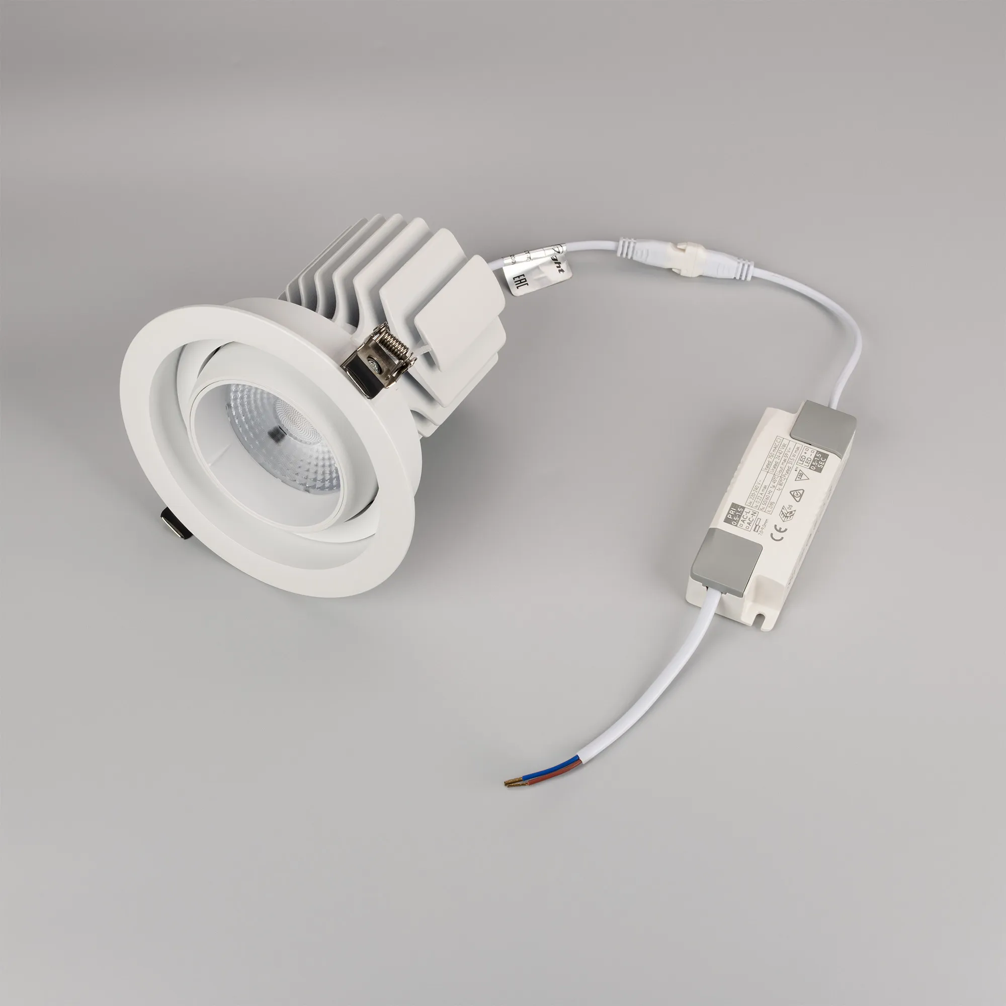 Встраиваемый карданный светильник. Мощность 30 Вт, св. поток 2650 лм, 88 лм/Вт, дневной 4000 K, CRI>92, угол 50°, напряжение питания 230 В. Белый корпус из алюминия, белая вставка, степень защиты IP20. Размер: диаметр 135 мм, высота 125 мм. Монтаж встраиваемый, установочное отверстие: диаметр 120 мм. Драйвер 24-42 В, 750 мА, пульсация <2%.