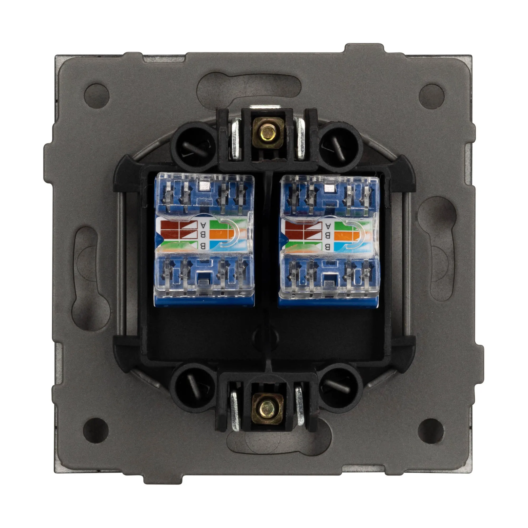 Механизм компьютерной розетки на 2 поста 6-й категории. Цвет - графитовый. Без фронтальной рамки. Уровень пылевлагозащиты IP20. Розетка устанавливается в стандартный подрозетник круглого сечения диаметром 60мм.