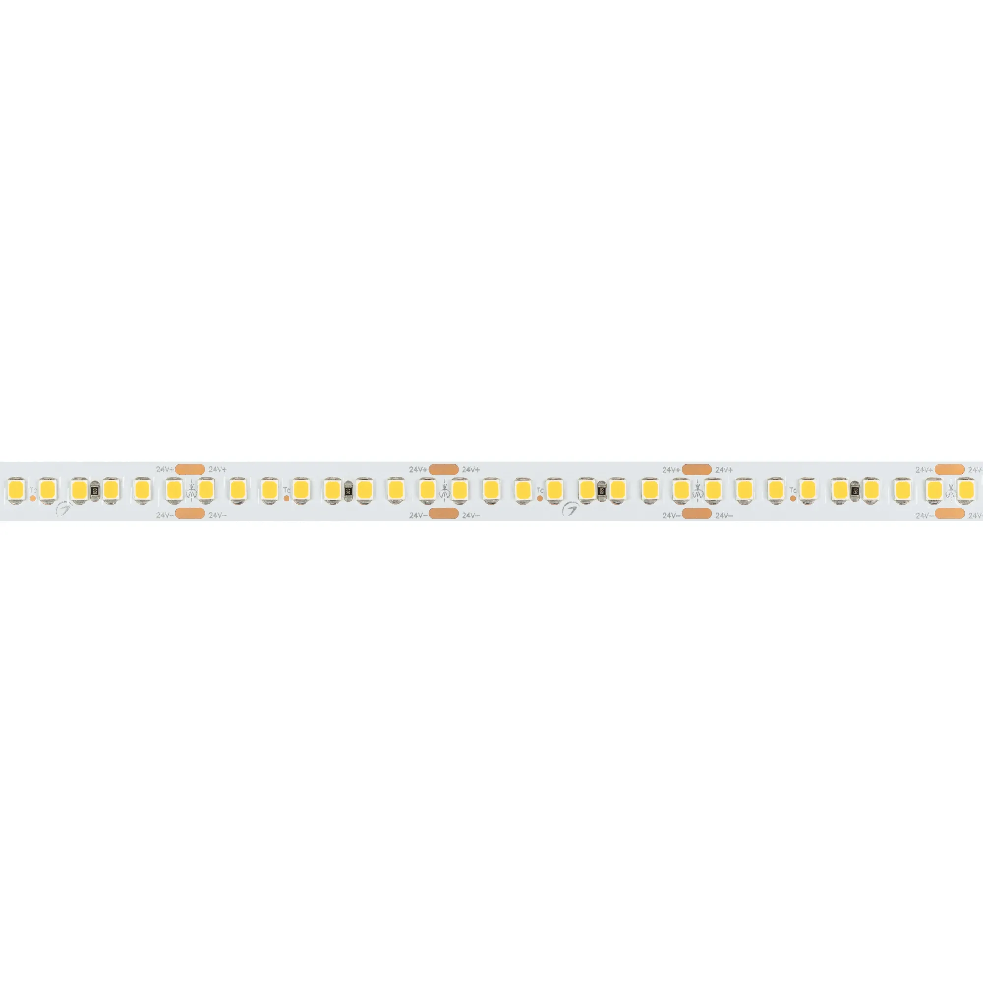 Светодиодная высокоэффективная лента RT серии A192. Светодиоды SMD 2835, 192 шт/м, белая плата шириной 10 мм, скотч 3M. Цвет ТЕПЛЫЙ 3000K, высокая световая эффективность 150 лм/Вт, индекс цветопередачи CRI>85, угол 120°. Питание 24 В, мощность 17.6 Вт/м (88 Вт на 5 м). Размеры 5000x10x1.6 мм. Мин. отрезок 41.67 мм, 8 светодиодов. Цена за 1 м. Обязательна установка на профиль.