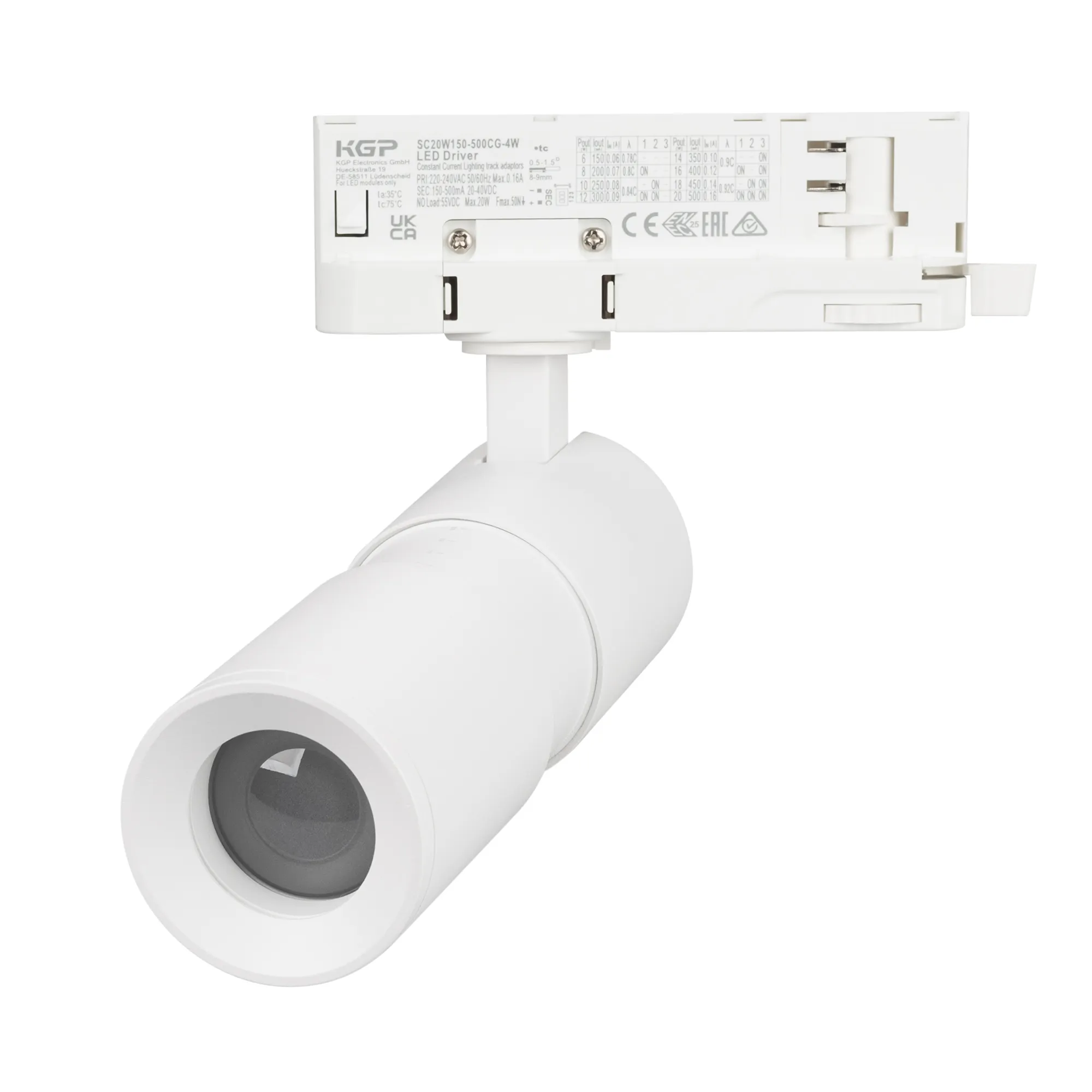 Светильник подвесной для треков/шин 4 провода, 12Вт, с управлением по протоколу TRIAC. Цвет свечения ТЁПЛЫЙ 2700K, световой поток 721 лм, 65 лм/Вт, регулируемый угол 8-80°, CRI>90. Корпус круглый, алюминий, цвет белый, IP20. Размеры L × W × H (Ø) 192 х 144 х Ø55 мм. Входное напряжение AC220-240V, мощность 12Вт. Драйвер TRIAC встроенный (20-40V, 250 мА). Пульсация <0,5%.
